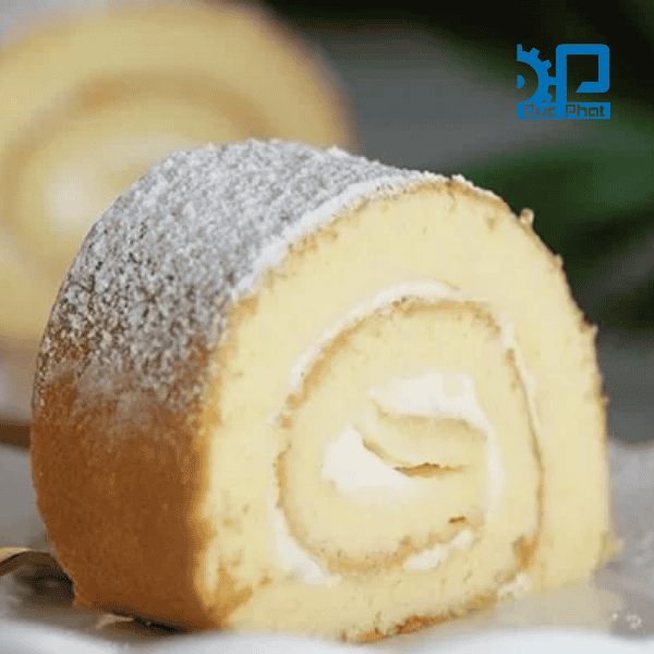 Bánh cuộn Thụy Sĩ: Bánh bông lan cuộn với kem. Dây chuyền có máy cán tạo hình và cuộn bánh tự động, cắt lát đều nhau bằng dao siêu âm.