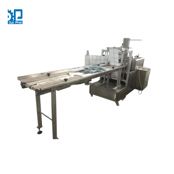 Máy đóng gói gạc rơ lưỡi túi 4 cạnh là thiết bị có chức năng đóng gói miếng gạc rơ lưỡi vào túi. Máy tự tạo túi 4 cạnh từ cuộn màng. Nhân công cấp miếng gạc rơ lưỡi lên băng tải, máy sẽ tự động đóng gói, tạo túi và hàn các cạnh túi, xuất thành phẩm.