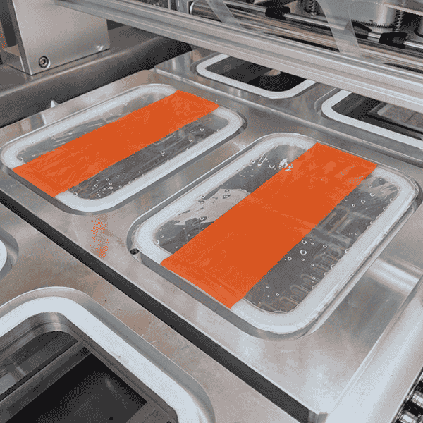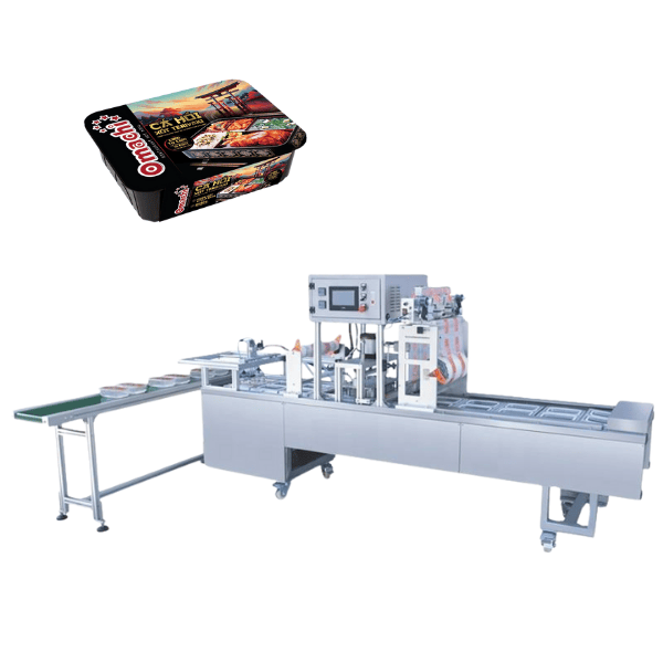 Máy đóng gói hộp đồ ăn liền được sử dụng trong các dây chuyền chế biến suất ăn công nghiệp, máy đảm bảo đóng kín sản phẩm vào hộp một cách đồng bộ.